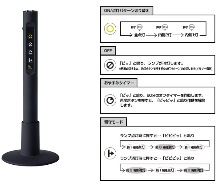 スタイリッシュなホワイトのリモコンはオン/オフ機能だけでなく点灯パターンの切り替え(全灯→2灯→1灯→消灯)、オフタイマー、留守モードがついているのでとっても便利。