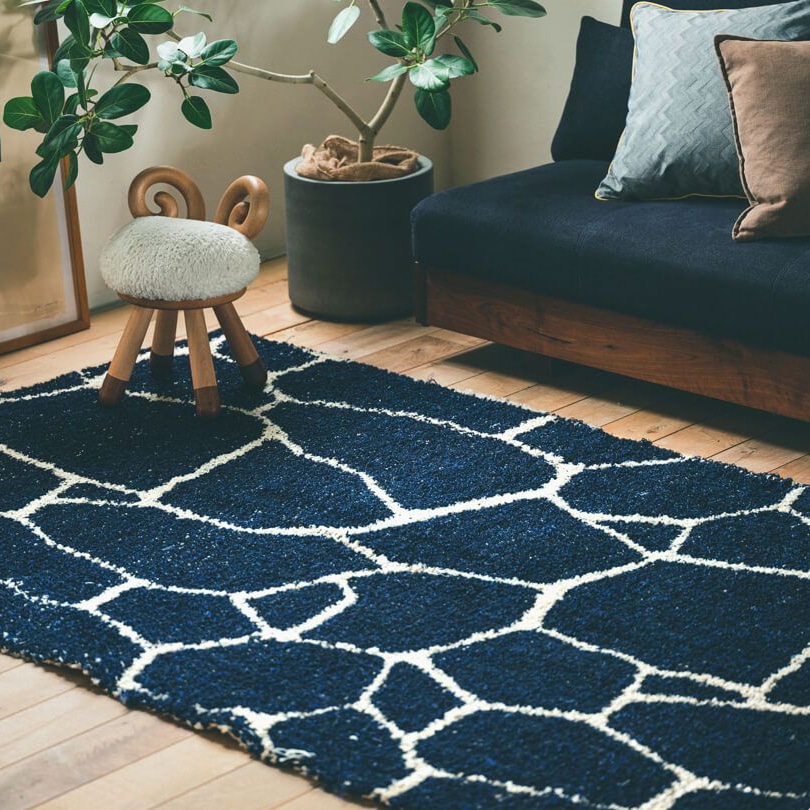 多角形が自由に連なるタイル模様のラグです。タイルとハラパの対照的な質感をデザインで融合させることにより、ユニークな印象を持たせました。大胆なラインが美しく、洗練された上質な空間が広がります。